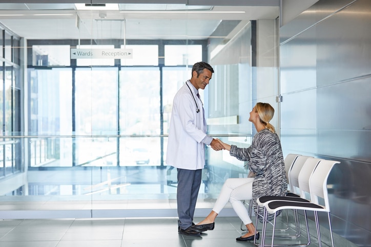 Young woman shaking hands with male doctor in waiting room. Female patient is visiting healthcare worker. They are in hospital.