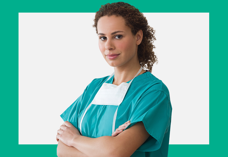 Dentista olha para a tela sobre um fundo branco e verde