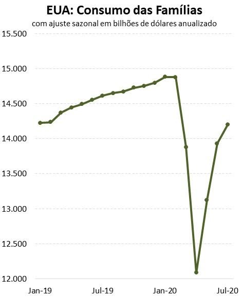 Um ponto interessante é que a poupança das famílias aumentou substancialmente entre março e julho (cerca de USD 1,1 trilhão acima do padrão). Parte relevante desses recursos ajudarão na sustentação do consumo daqui para frente. Assim, projetamos retração do PIB real americano em ‘apenas’ 3,8% neste ano, muito diferente da expectativa do FMI de queda de -5,9%.