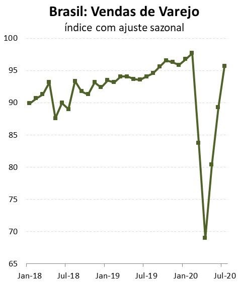 No Brasil, a recuperação da atividade econômica também tem surpreendido positivamente os mais ‘conservadores’. As vendas de varejo já voltaram grande parte da queda ocorrida entre março e abril, como mostra a Figura 2. O retorno do consumo tem incentivado a produção e, consequentemente, a utilização de capacidade instalada da indústria manufatureira já atingiu o mesmo patamar do início do ano.
