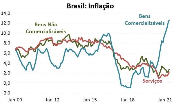Importante destacar que os preços dos bens que dependem exclusivamente da demanda interna (bens não comercializáveis) e do setor de serviços continuam bem-comportados, como mostra a Figura 1. Enfim, até agora temos uma inflação concentrada nos bens comercializáveis e regulados pelo governo.