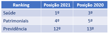 A Companhia subiu uma posição com a empresa Seguros Patrimoniais, passando de 5º para 4º. Na Previdência também subiu um lugar em comparação com o ranking de 2020, ocupando, neste ano, o 12º lugar. Na saúde, a Seguradora também melhorou o desempenho, já que no ano passado estava em 3º lugar.