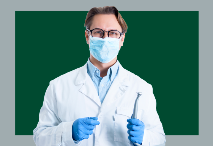 homem de máscara e jaleco branco segurando um aparelho de dentista