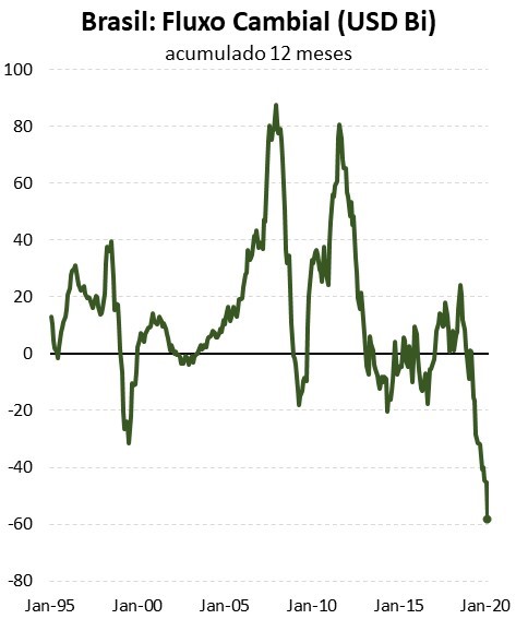Dessa forma, houve saída líquida de 58 bilhões de dólares do país nos últimos 12 meses. O fluxo cambial continua deteriorando rapidamente, o que reforça a tendência de desvalorização cambial (ver últimos relatórios).