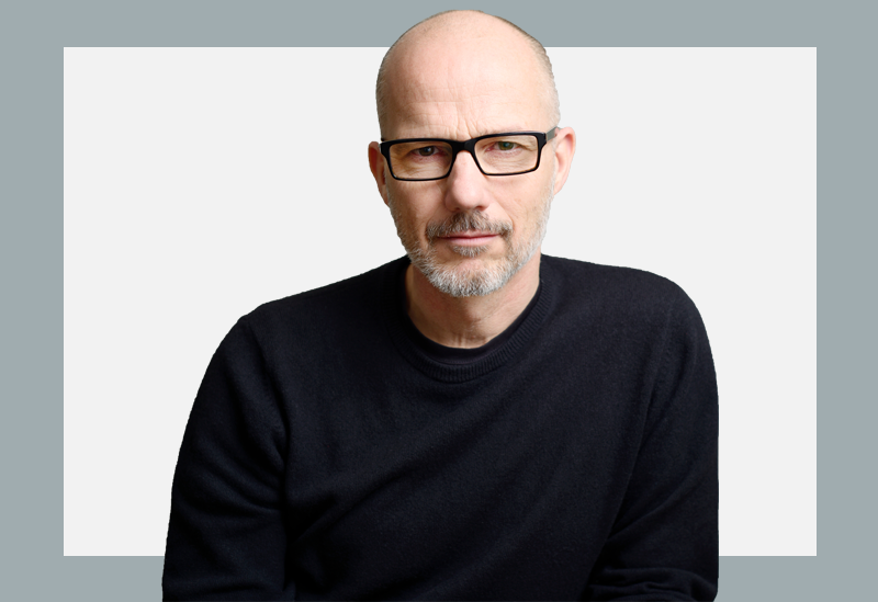 Homem de óculos e blusa preta olha com semblante sério para a câmera sobre fundo branco e cinza
