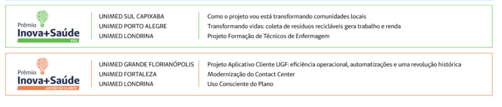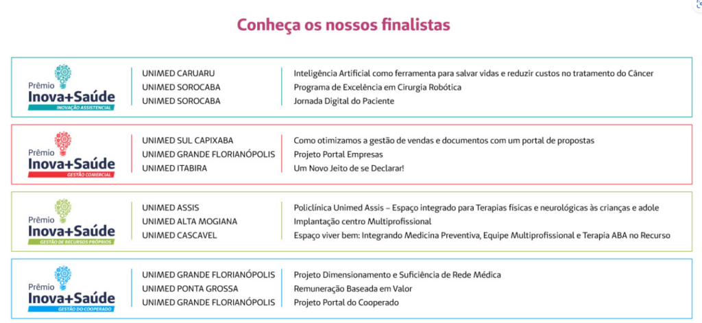Nesta edição, foram inscritos 229 cases, julgados por seis jurados. Os cases do Acelera Unimed, que passaram a integrar a premiação neste ano, serão acelerados pelo hub de inovação da Unimed do Brasil. Criado em 2015, o Inova+Saúde tem as parcerias da Unimed do Brasil e da Faculdade Unimed.