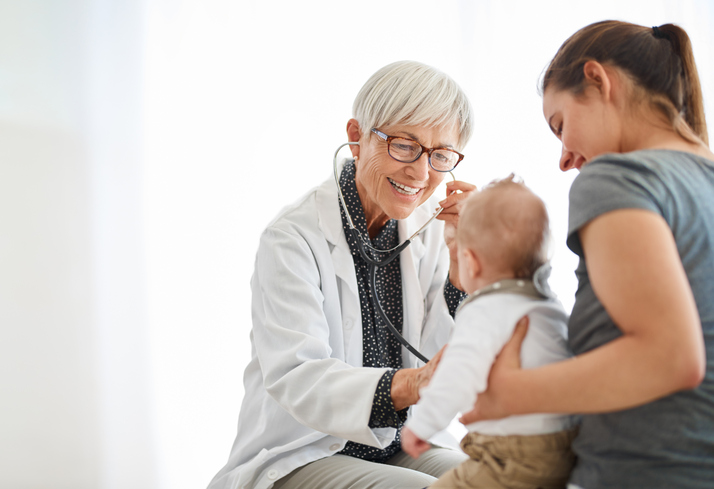 Shot of a young mother taking her baby daughter for a checkup at the doctor’s office