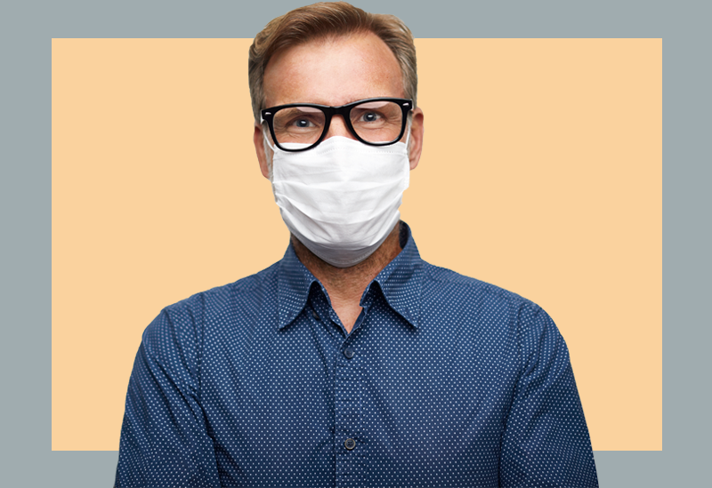 Homem de máscara cirúrgica e blusa vinho olha para a câmera sobre um fundo branco e bege