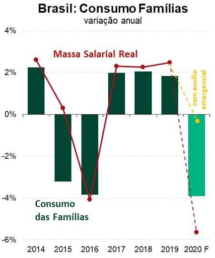 A principal medida é o auxílio emergencial, que atinge 64,5 milhões de pessoas e injetará mais de R$ 250 bilhões no orçamento das famílias nesse ano, equivalente a cerca de 5,2% do gasto anual com consumo.